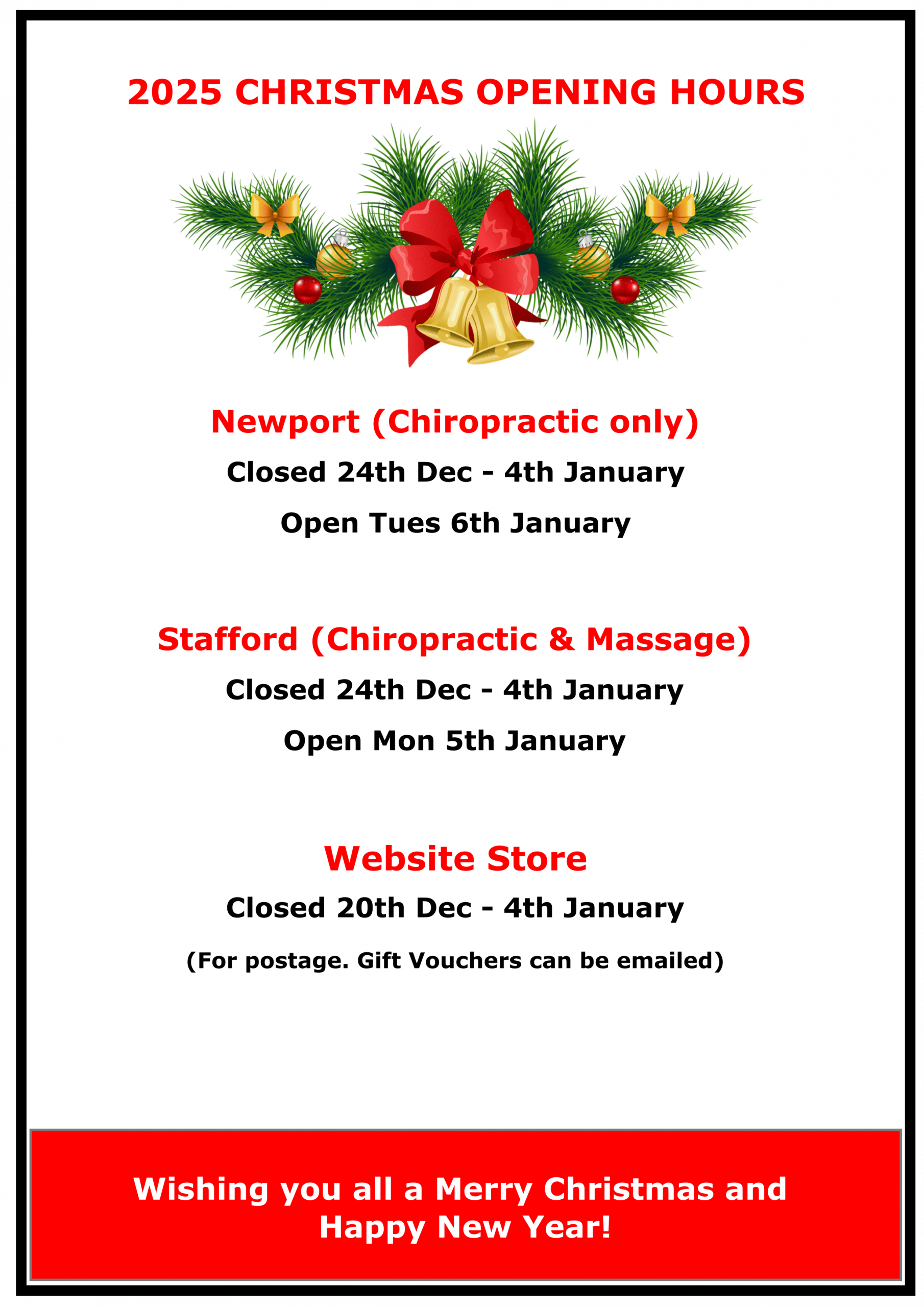 If you’d like a Christmas chiropractic or massage appointment before we break up, please book now as our final day is Monday 22nd December for Chiropractic, and Tuesday 23rd December for massage. We will then be closed until Monday 5th January. For our full hours, please see below.